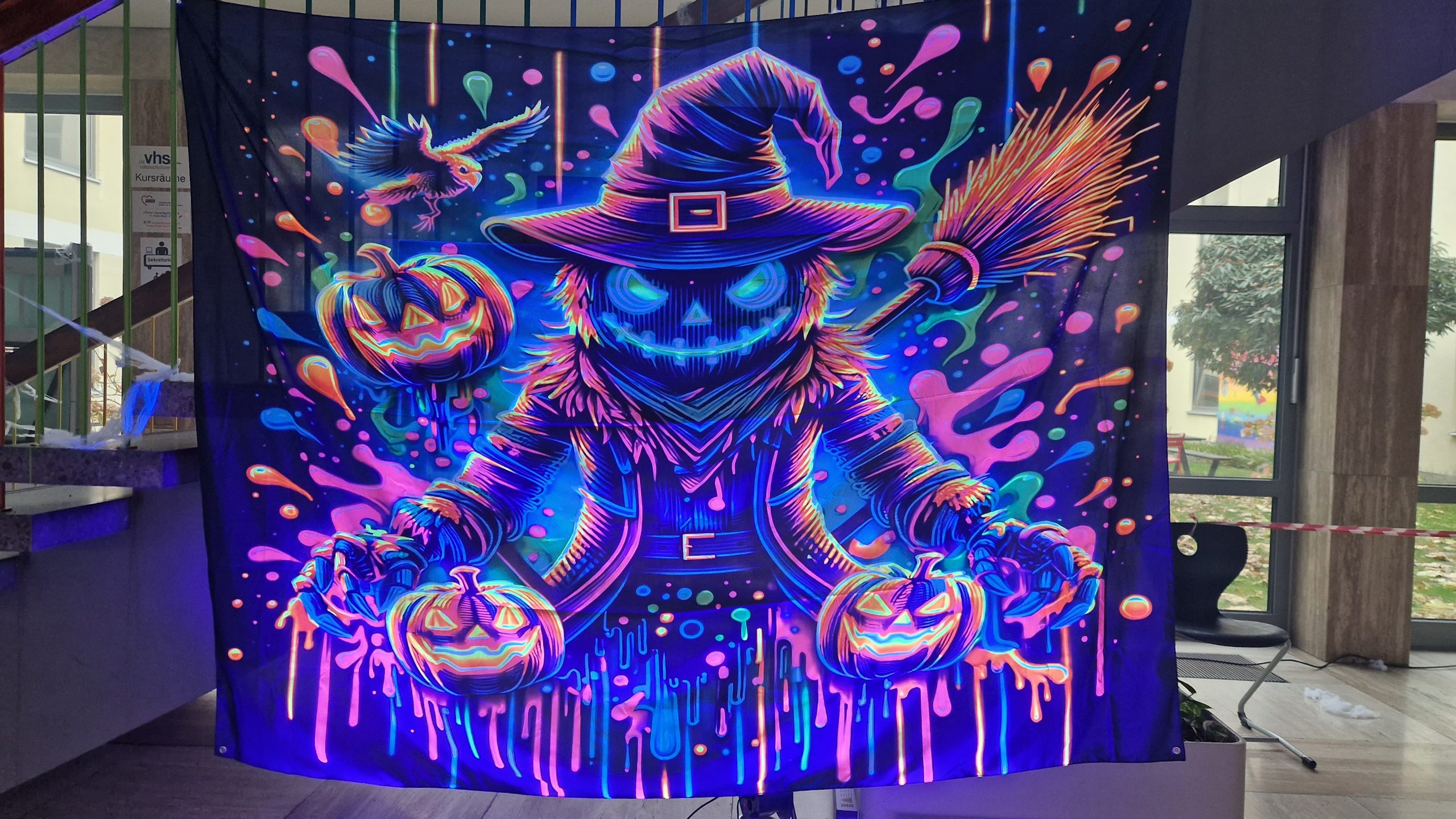 Bereits in der Vorviertelstunde herrschte eine schaurig-schöne Atmosphäre: Die vordere Aula war in dichten Nebel, mystisches Schwarzlicht und gruselige Dekoration gehüllt. Parallel dazu sorgte unheimliche Gruselmusik im gesamten Schulhaus für die passende Stimmung.
