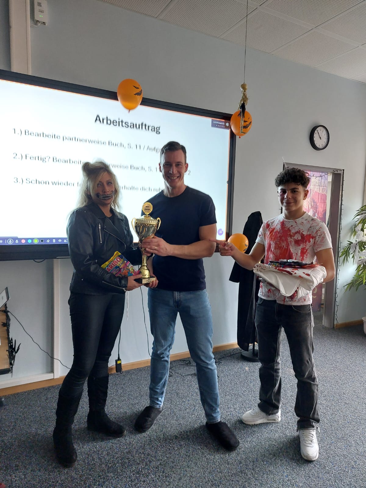 Wanderpokal „Gruseligstes Klassenzimmer“: Die Klasse 7b mit ihrer Klassleitung Herrn Österreicher. Herzlichen Glückwunsch zu dieser schaurig-kreativen Leistung!