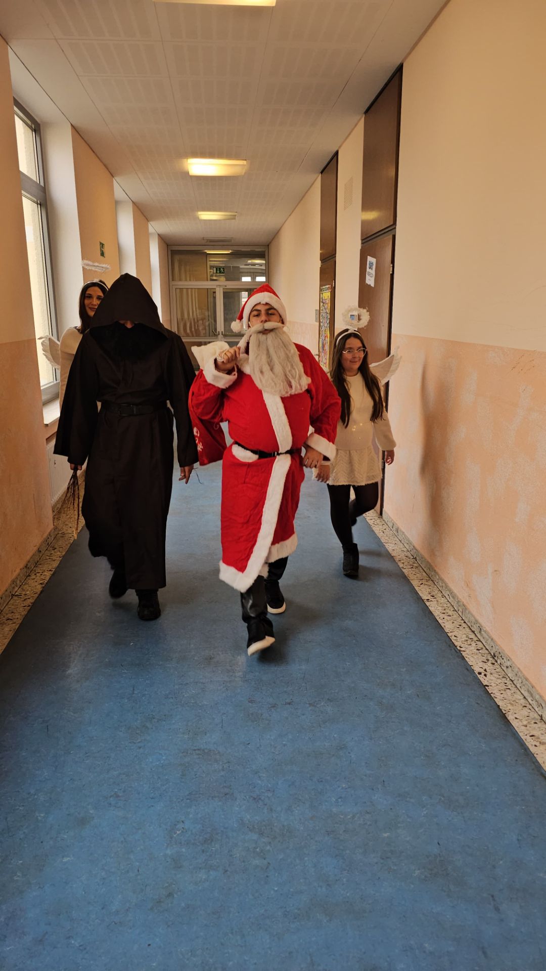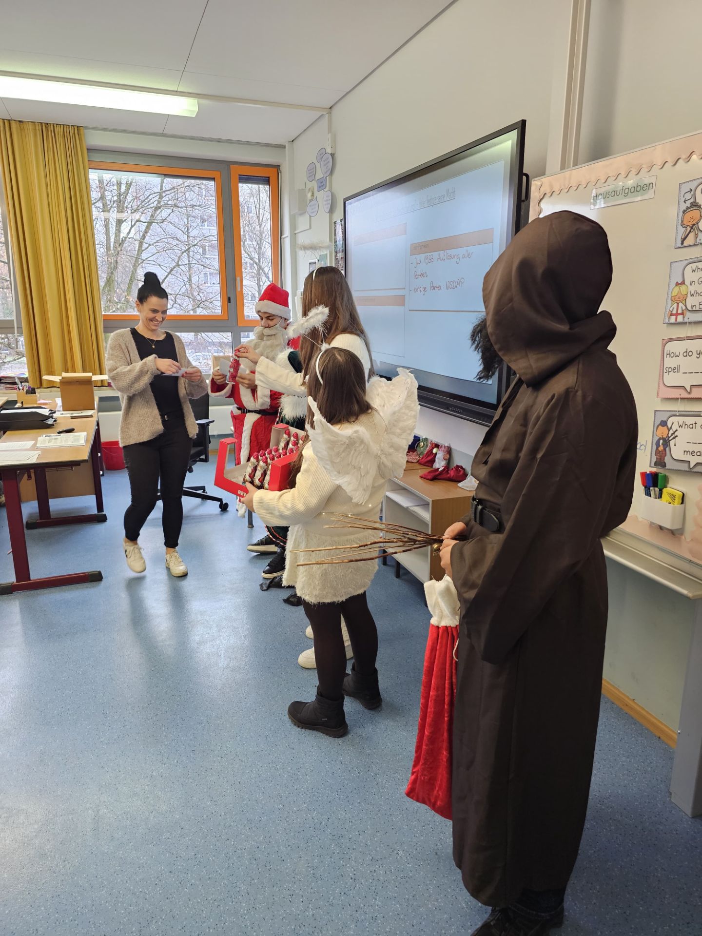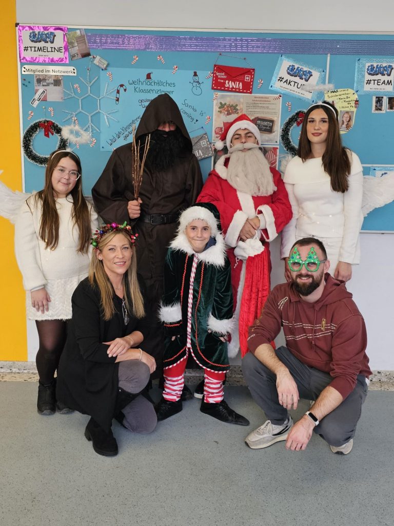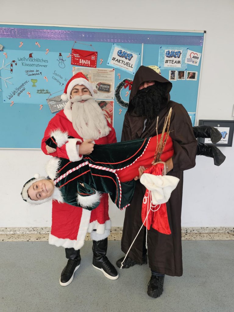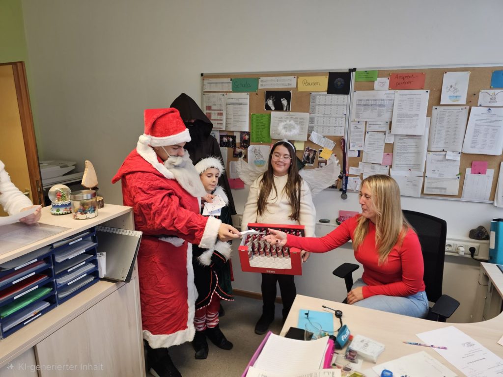 Am 5. Dezember war es wieder so weit: Unsere SMV sorgte für eine stimmungsvolle Nikolausaktion, die in diesem Jahr erneut zahlreiche Schülerinnen und Schüler erfreute. Viele hatten im Vorfeld liebevoll gestaltete Grußkarten bestellt, die gemeinsam mit einem Schoko-Nikolaus an die glücklichen Empfänger verteilt wurden. Unter der Leitung von Frau Kluger und Herrn Wagner waren ein Nikolaus, ein Krampus, ein Elf sowie zwei Engel im Schulhaus unterwegs und verbreiteten adventliche Stimmung.